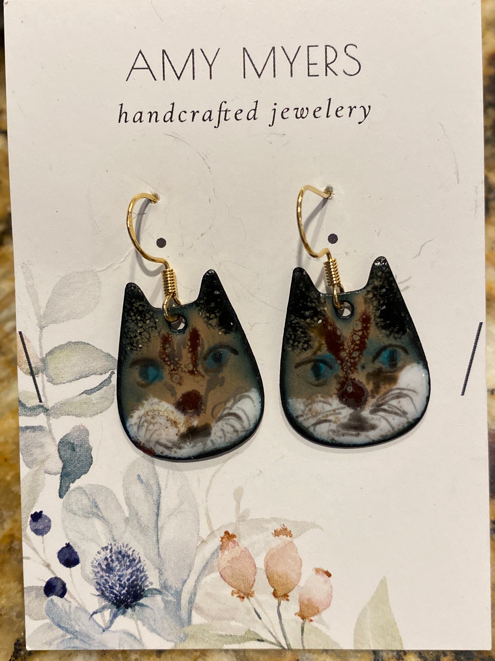 Whimsical earrings featuring enamel-painted cat faces. A lighthearted statement piece for cat lovers.