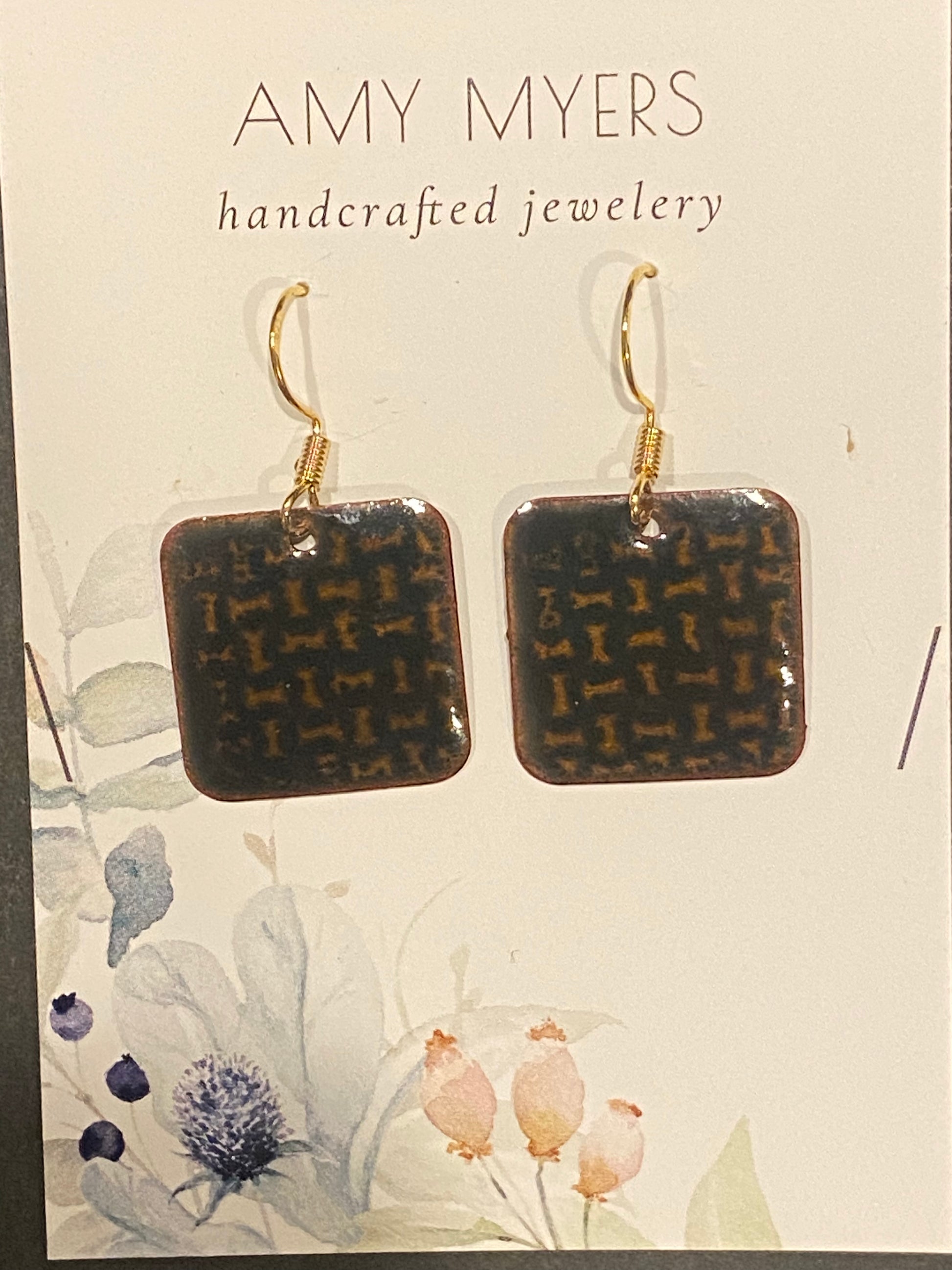 These artisan square enamel earrings feature a warm brown background enhanced by a bold black abstract pattern, offering a subtle yet eye-catching design.